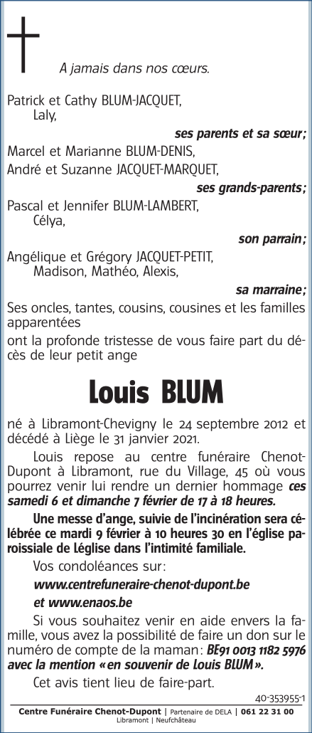 Décédé à Liège (4000) le dimanche 31 janvier 2021 à l'âge de 8 ans