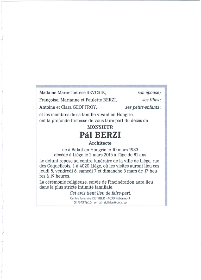 Décédé à Liège (4000) le lundi 2 mars 2015 à l'âge de 81 ans