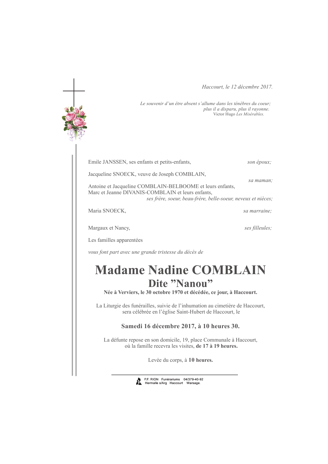 Fallecida en Haccourt (4684) el martes, 12 de diciembre de 2017 a la edad de 47 años