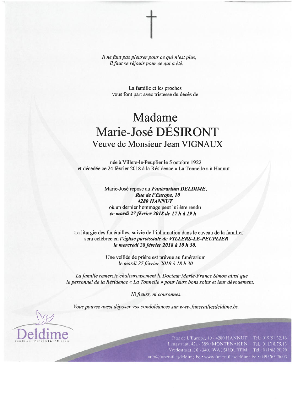 Décédée à Hannut (4280) le samedi 24 février 2018 à l'âge de 95 ans