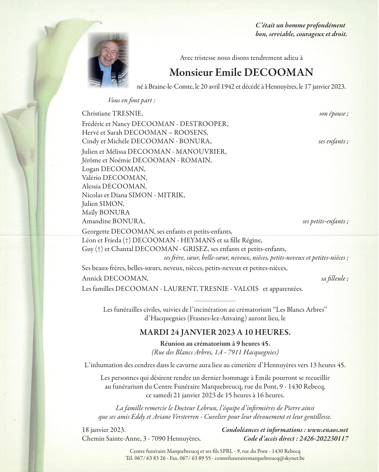 Fallecido en Hennuyères (7090) el martes, 17 de enero de 2023 a la edad de 80 años