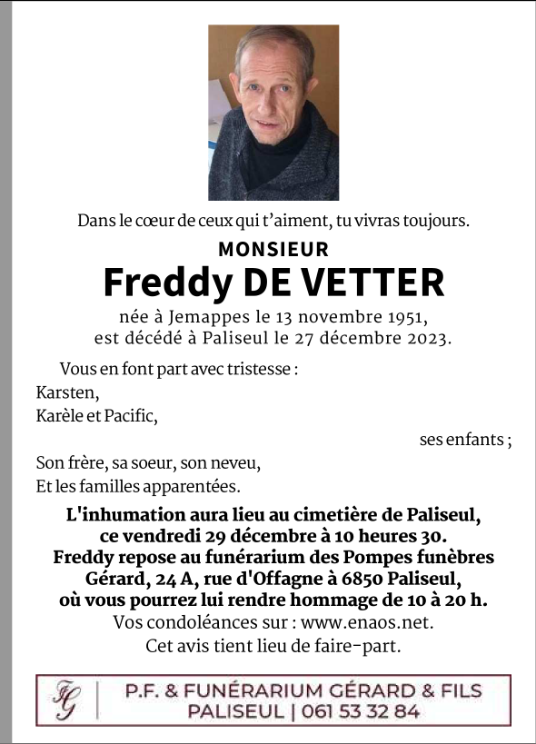 Décédé à Paliseul (6850) le mercredi 27 décembre 2023 à l'âge de 72 ans