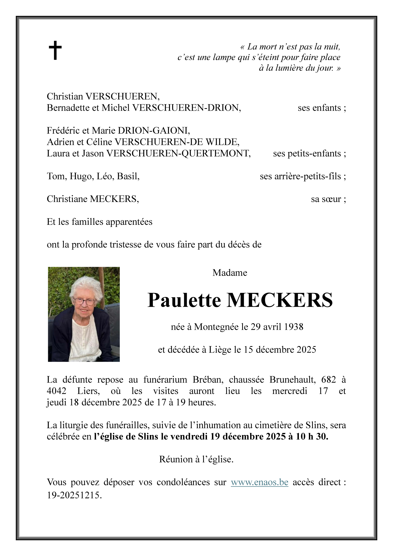 Décédée à Liège (4000) le lundi 15 décembre 2025 à l'âge de 87 ans