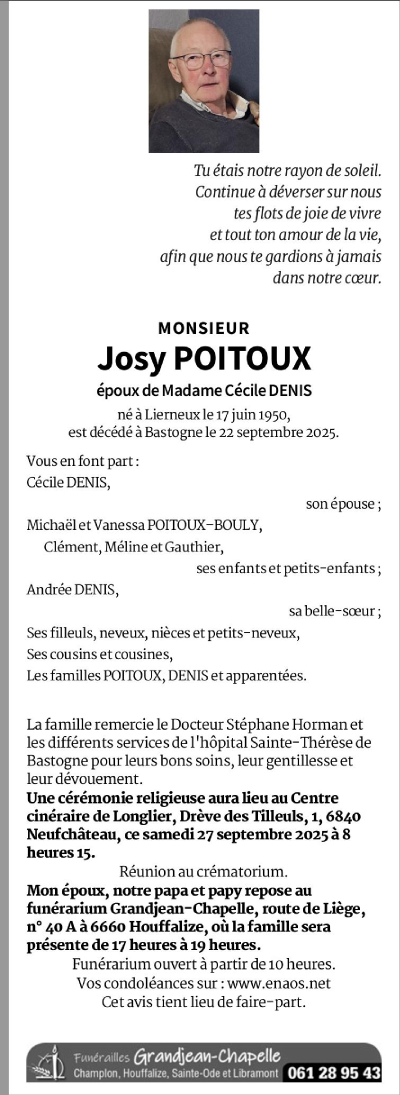 Fallecido en Bastogne (6600) el lunes, 22 de septiembre de 2025 a la edad de 75 años
