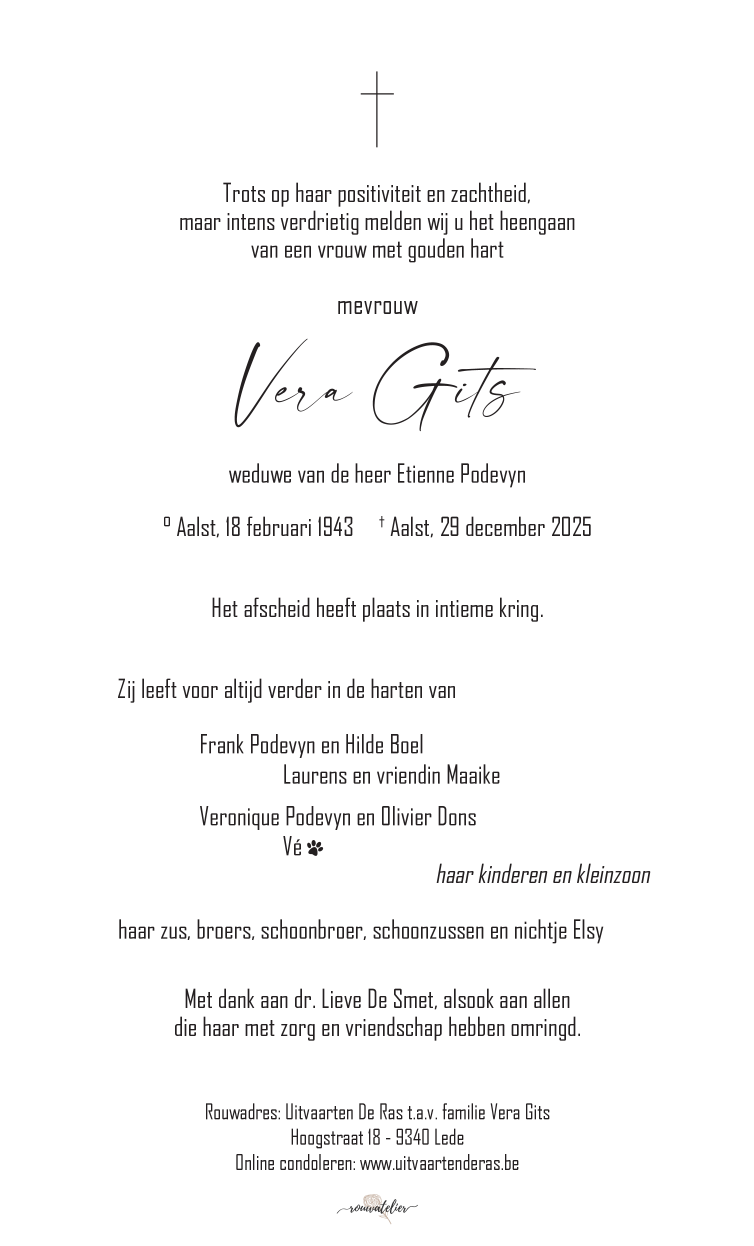 Décédée à Aalst (9300) le lundi 29 décembre 2025 à l'âge de 82 ans