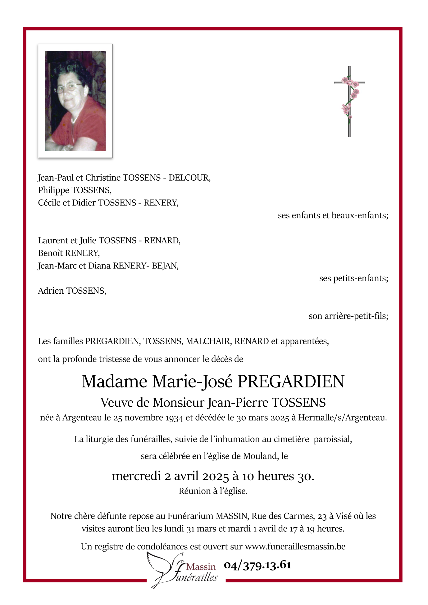 Madame Marie-José PREGARDIEN Vve J-P TOSSENS