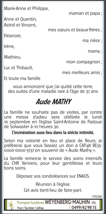 Décédée à Verviers (4800) le mercredi 11 septembre 2024 à l'âge de 37 ans