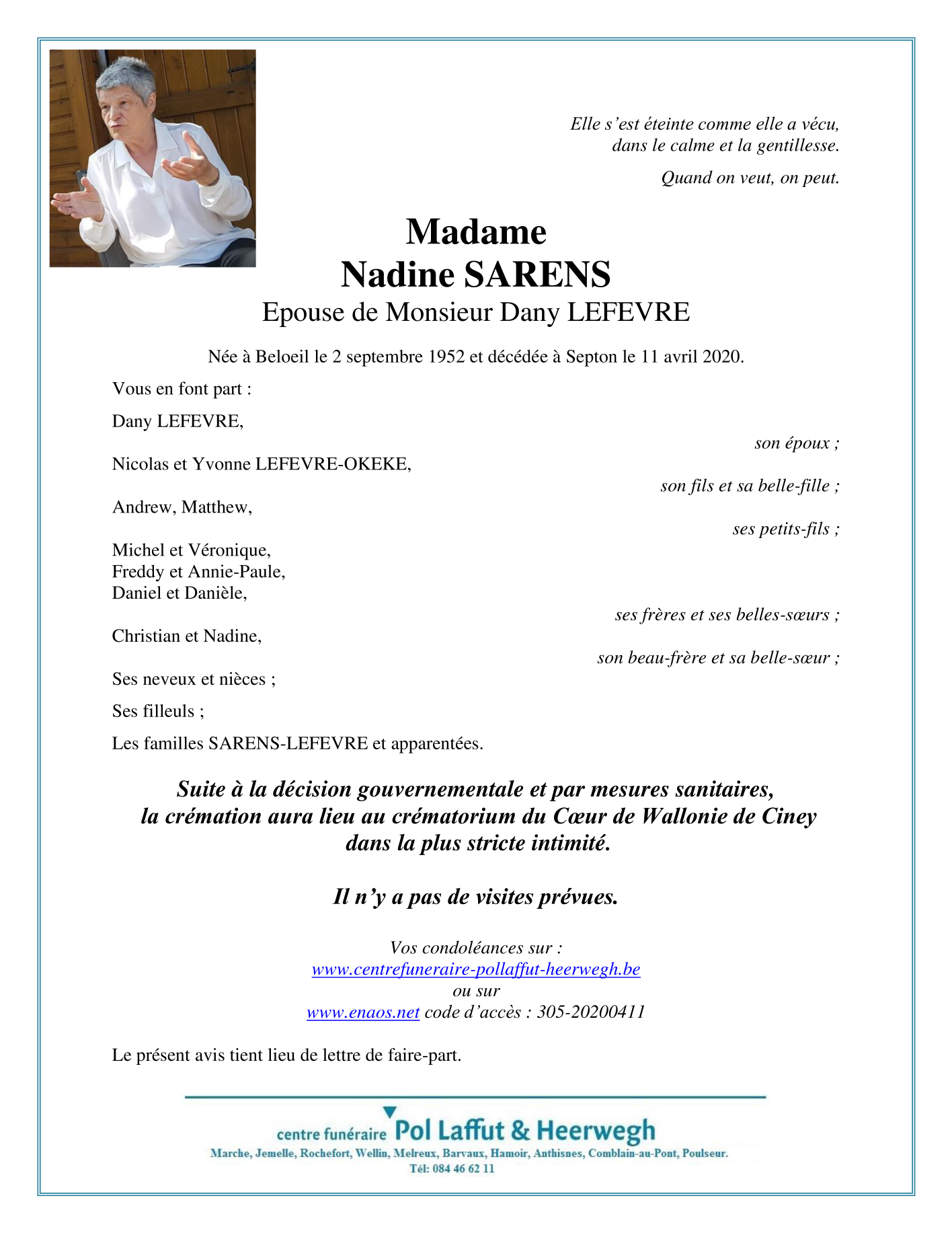 Died in Septon (6940) on 11 April 2020 at the age of 67 years