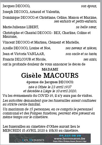 Died in Liège (4000) on 10 April 2020 at the age of 82 years