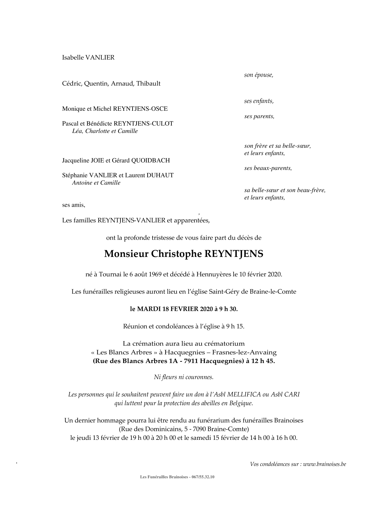 Fallecido en Hennuyères (7090) el lunes, 10 de febrero de 2020 a la edad de 50 años