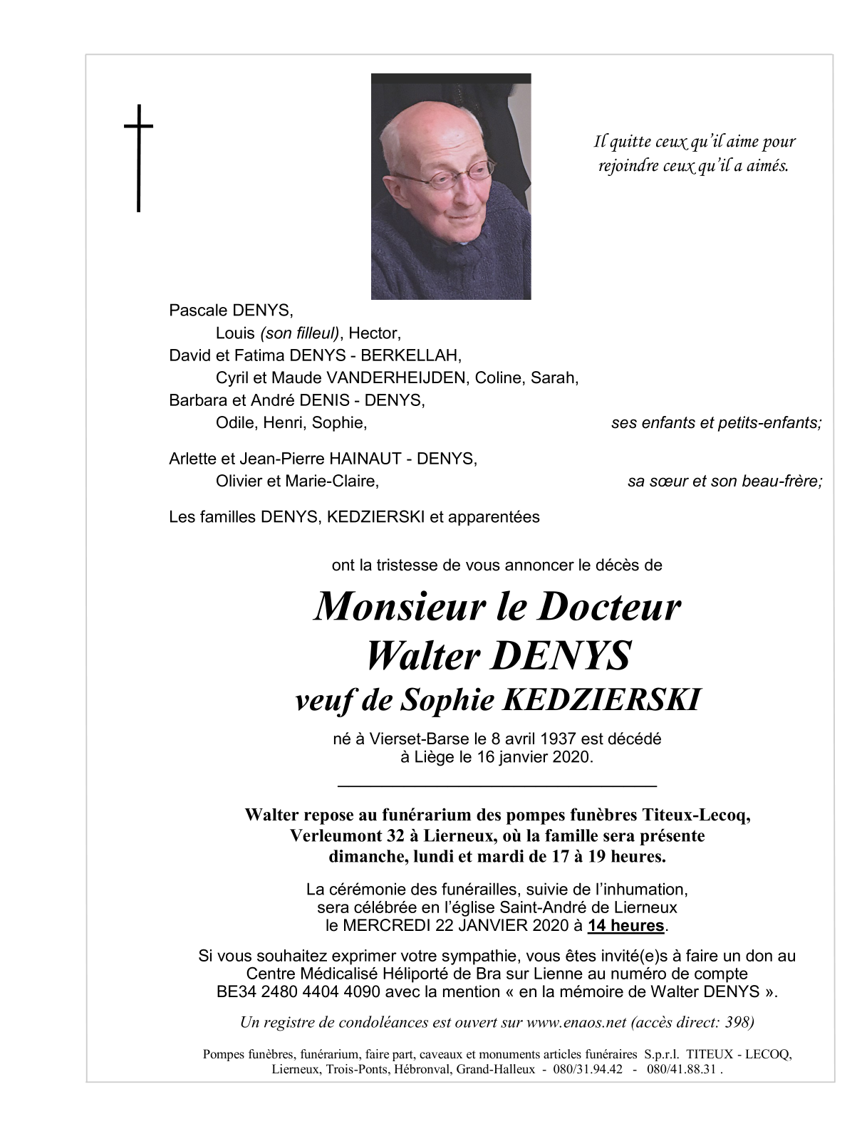 Décédé à Liège (4000) le jeudi 16 janvier 2020 à l'âge de 82 ans
