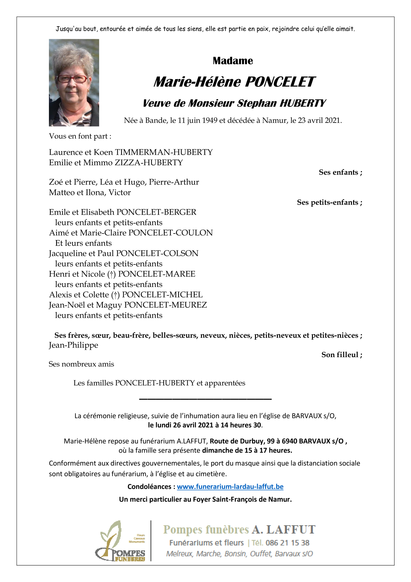 Décédé à Namur (5000) le vendredi 23 avril 2021 à l'âge de 71 ans