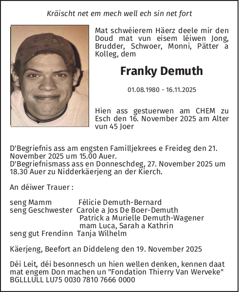 Décédé à Esch-Sur-Alzette/Mayrisch  (4240, Luxembourg) le dimanche 16 novembre 2025 à l'âge de 45 ans
