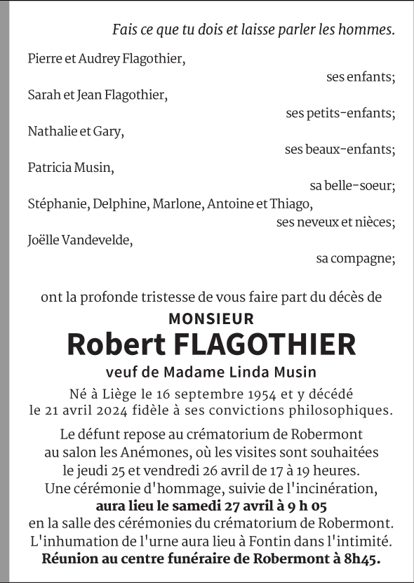 Décédé à Liège (4000) le dimanche 21 avril 2024 à l'âge de 69 ans