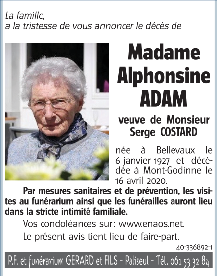 Décédée à Mont-Godinne (5530) le jeudi 16 avril 2020 à l'âge de 93 ans