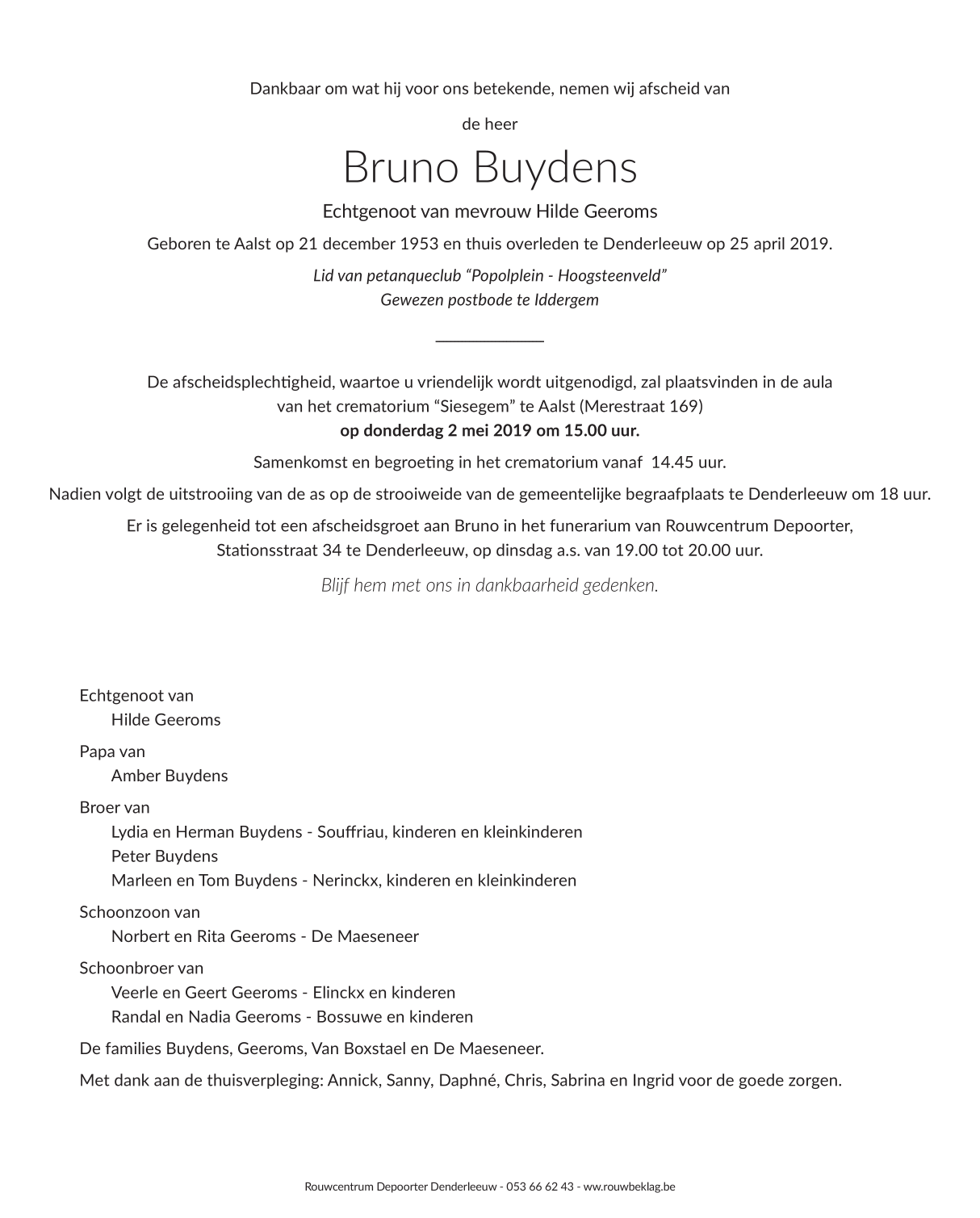 Died in Denderleeuw (9470) on 25 April 2019 at the age of 65 years