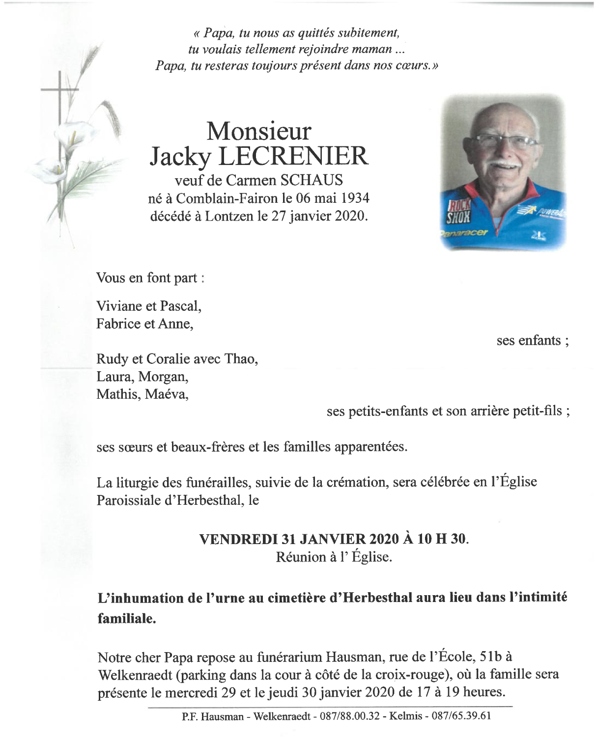 Died in Lontzen (4710) on 27 January 2020 at the age of 85 years