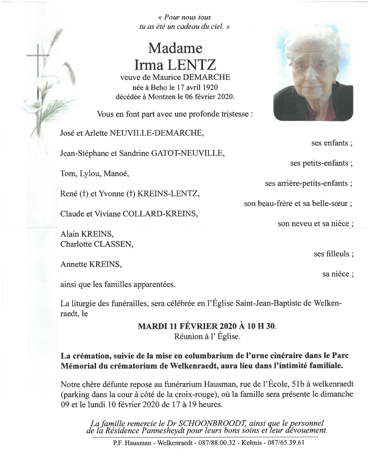 Décédée à Montzen (4850) le jeudi 6 février 2020 à l'âge de 99 ans