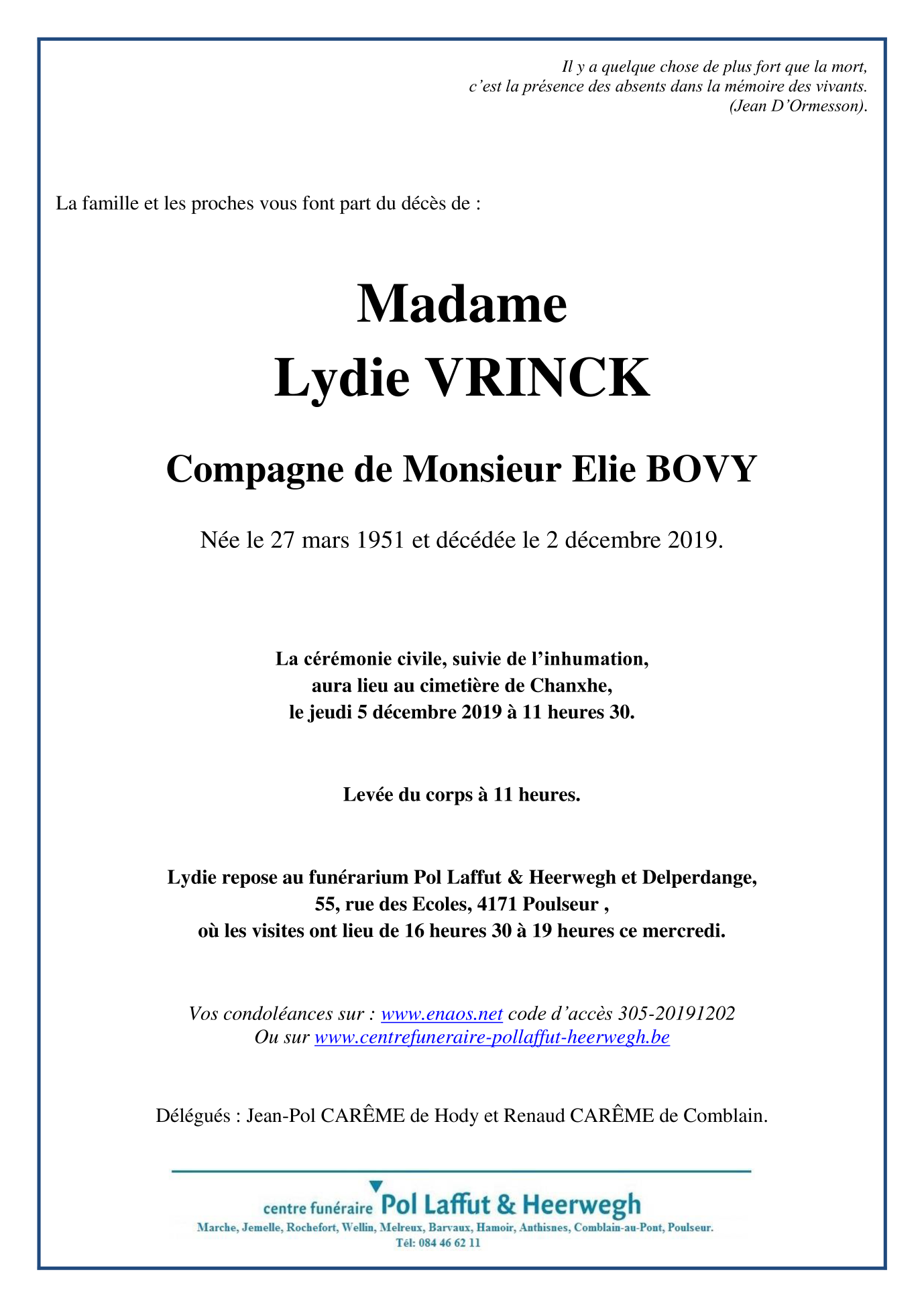 Décédée à Liège (4000) le lundi 2 décembre 2019 à l'âge de 68 ans