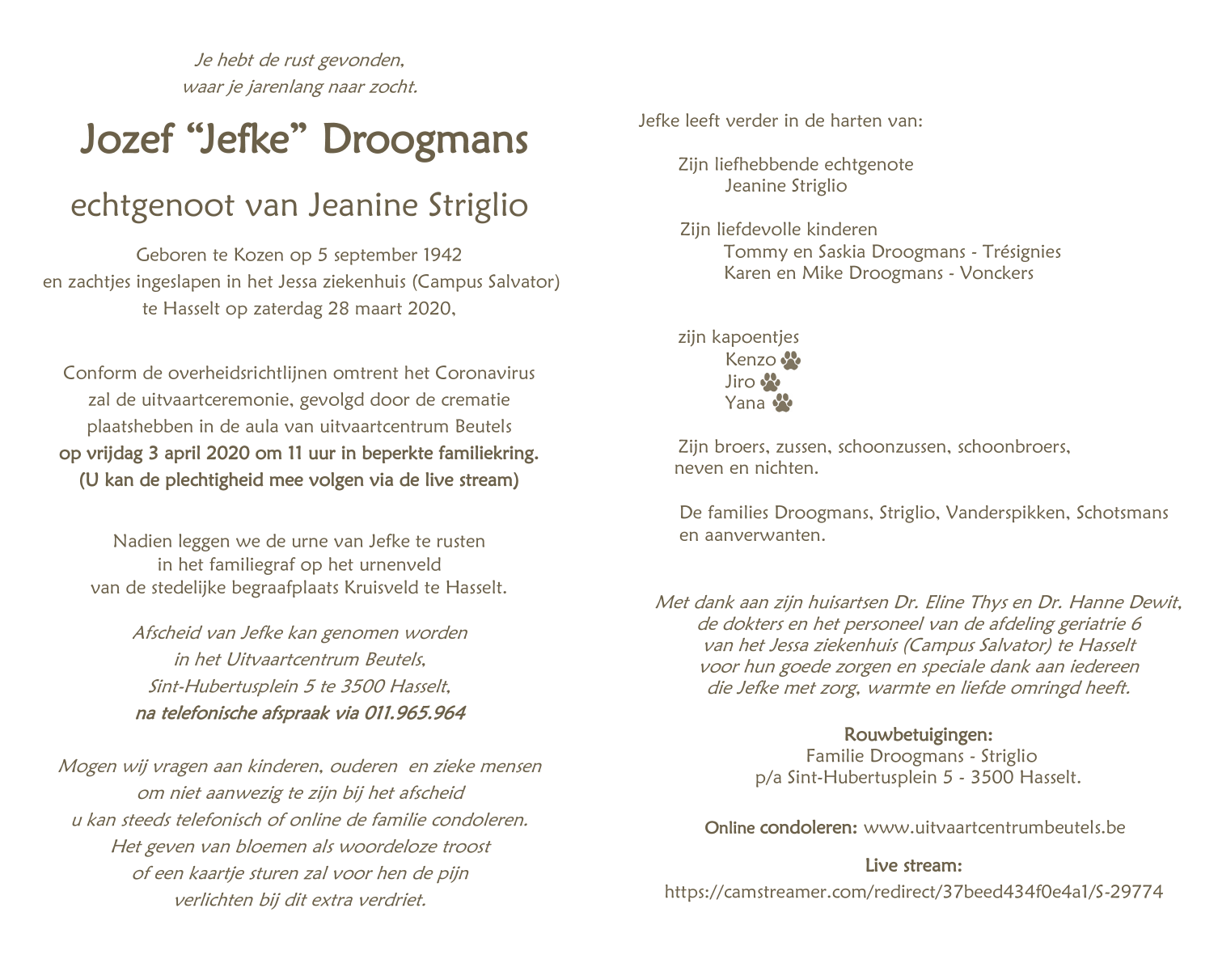 Died in Hasselt (3500) on 28 March 2020 at the age of 77 years
