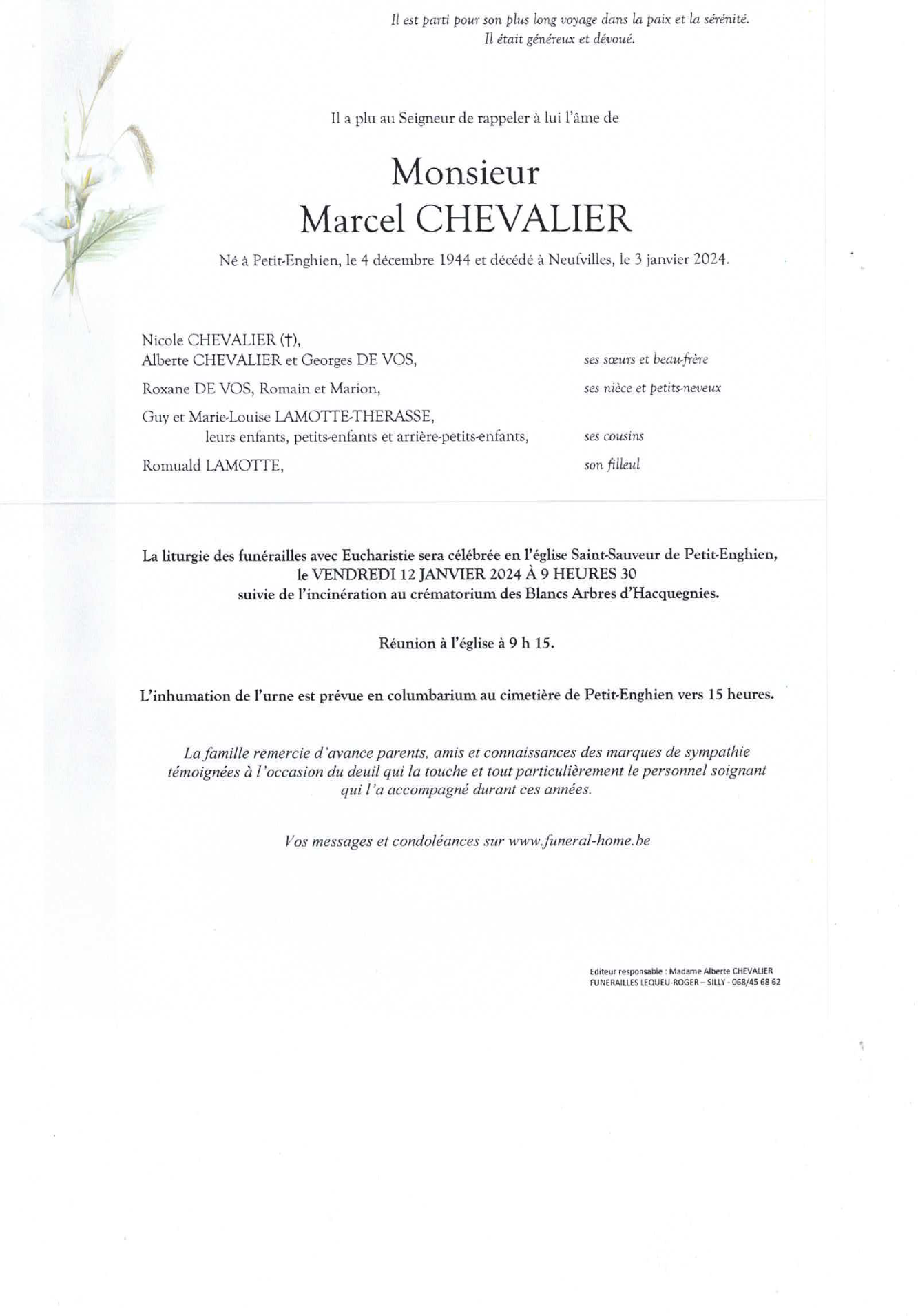 Décédé à Neufvilles (7063) le mercredi 3 janvier 2024 à l'âge de 79 ans