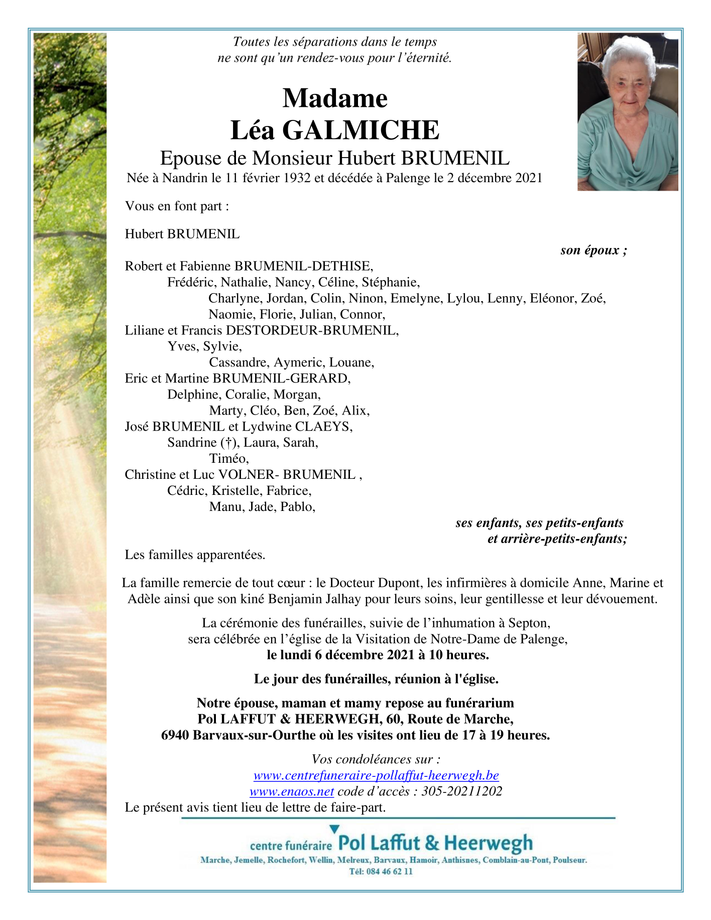 Décédée à Palenge (6940) le jeudi 2 décembre 2021 à l'âge de 89 ans