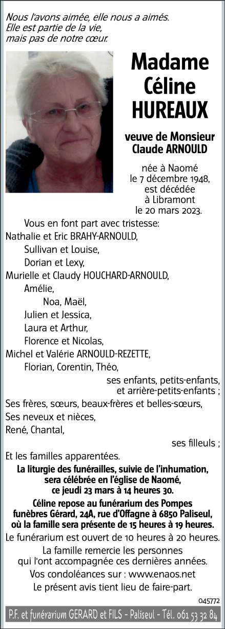 Fallecida en Libramont (6800) el lunes, 20 de marzo de 2023 a la edad de 74 años