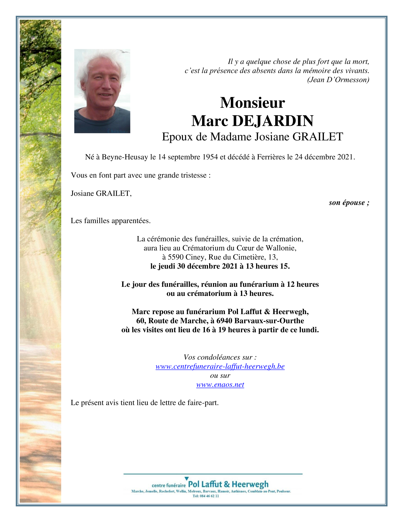 Died in Ferrières (4190) on 24 December 2021 at the age of 67 years