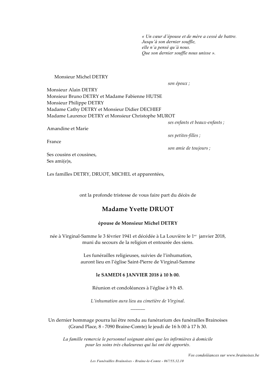 Fallecida en La Louvière (7100) el lunes, 1 de enero de 2018 a la edad de 76 años