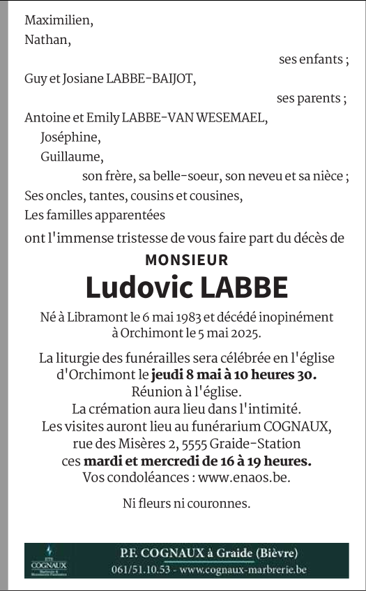 Décédé à Orchimont (5550) le lundi 5 mai 2025 à l'âge de 41 ans