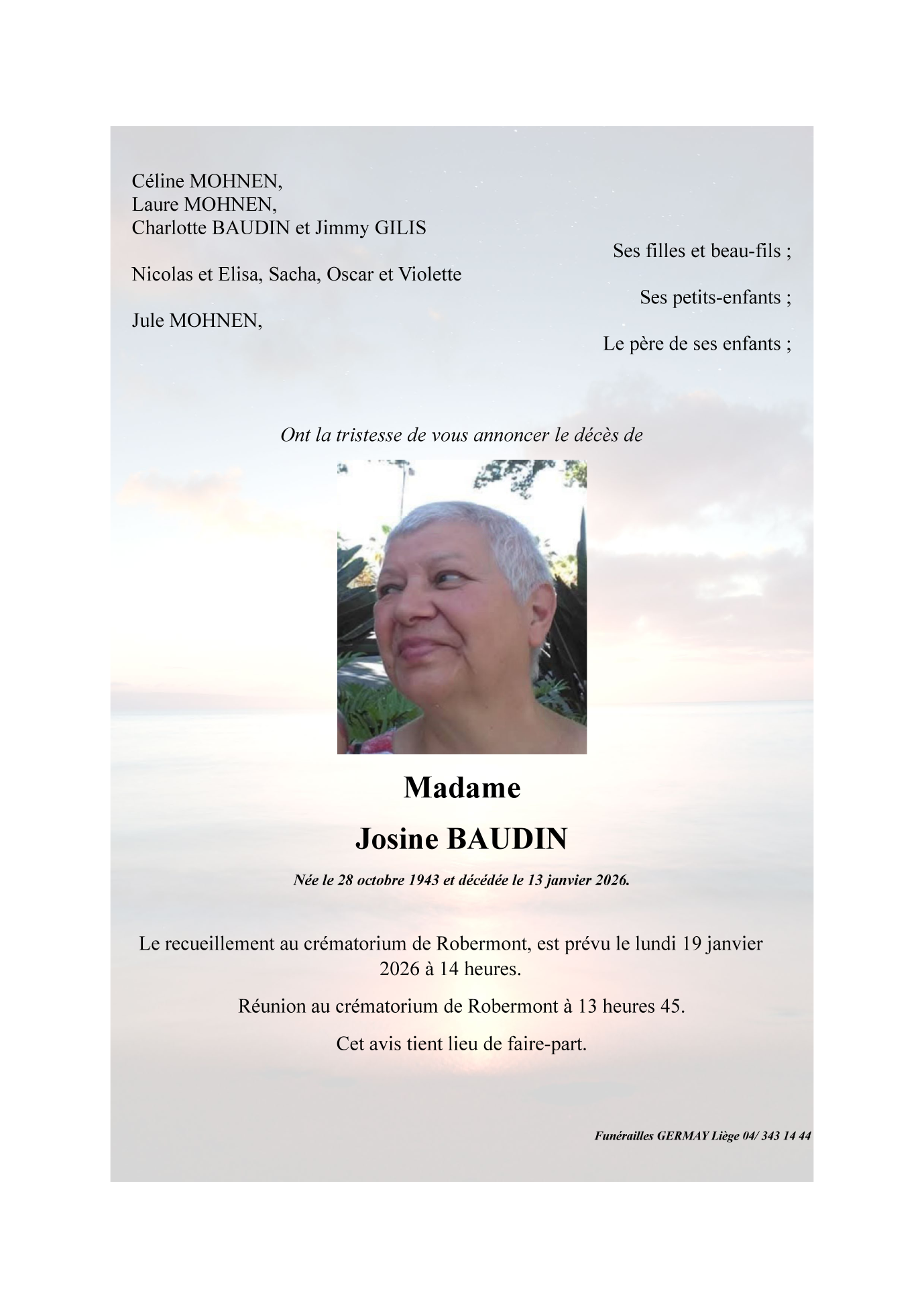 Décédée à Liège (4000) le mardi 13 janvier 2026 à l'âge de 82 ans