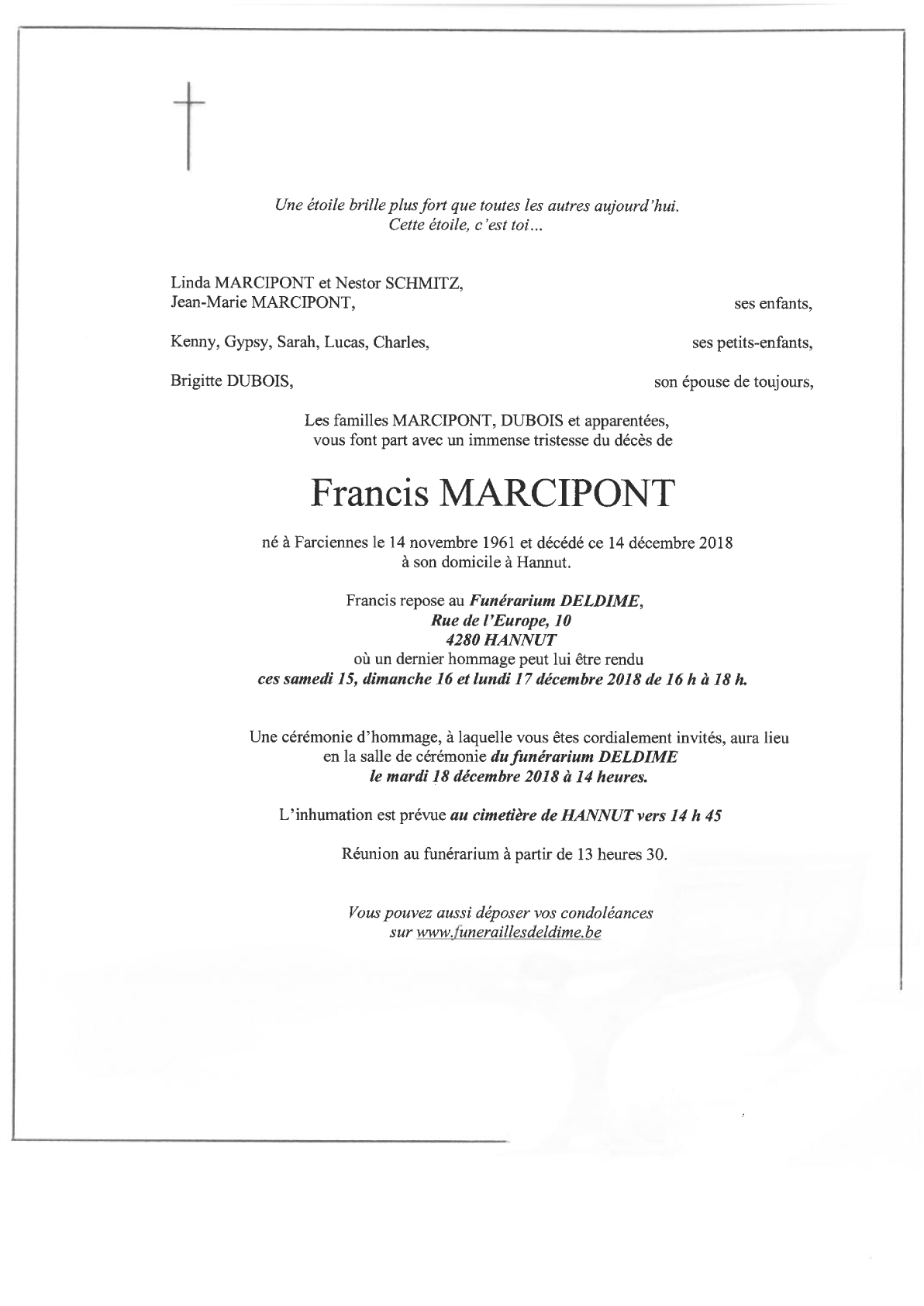 Décédé à Hannut (4280) le vendredi 14 décembre 2018 à l'âge de 57 ans
