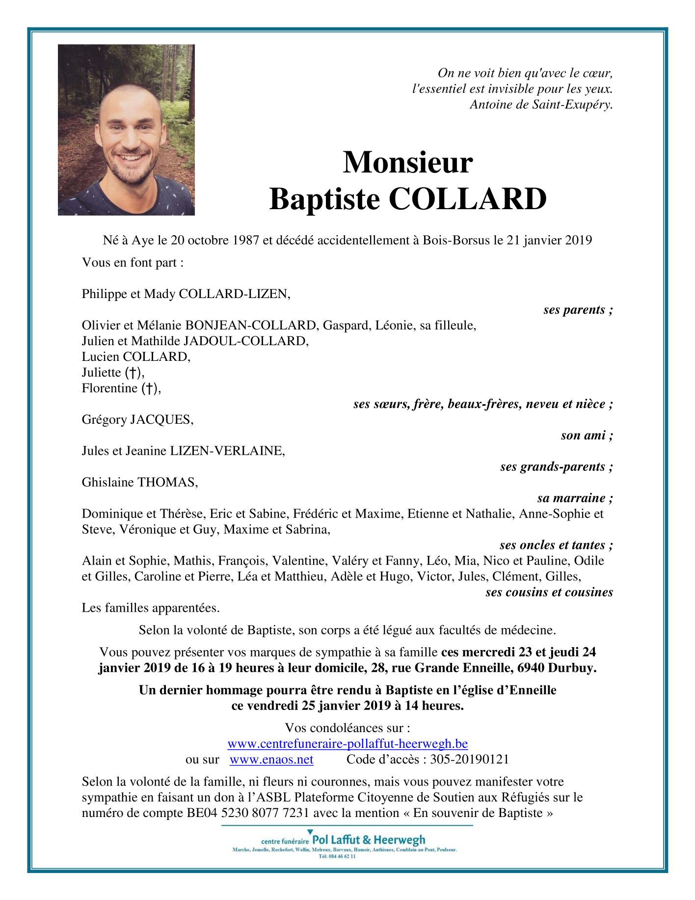 Décédé à Bois-et-Borsu (4560) le lundi 21 janvier 2019 à l'âge de 31 ans