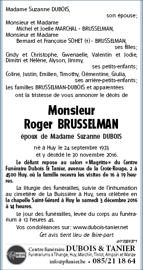 Décédé à Huy (4500) le mercredi 30 novembre 2016 à l'âge de 83 ans