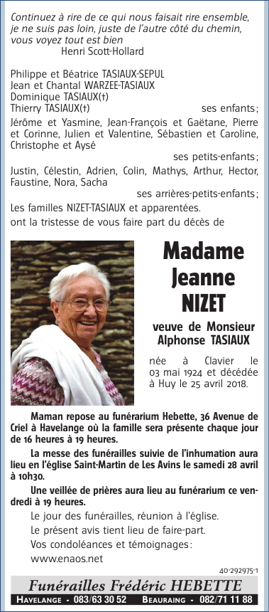 Fallecida en Huy (4500) el miércoles, 25 de abril de 2018 a la edad de 93 años