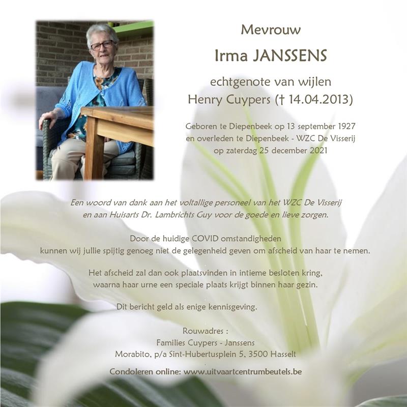 Fallecida en Diepenbeek (3590) el sábado, 25 de diciembre de 2021 a la edad de 94 años
