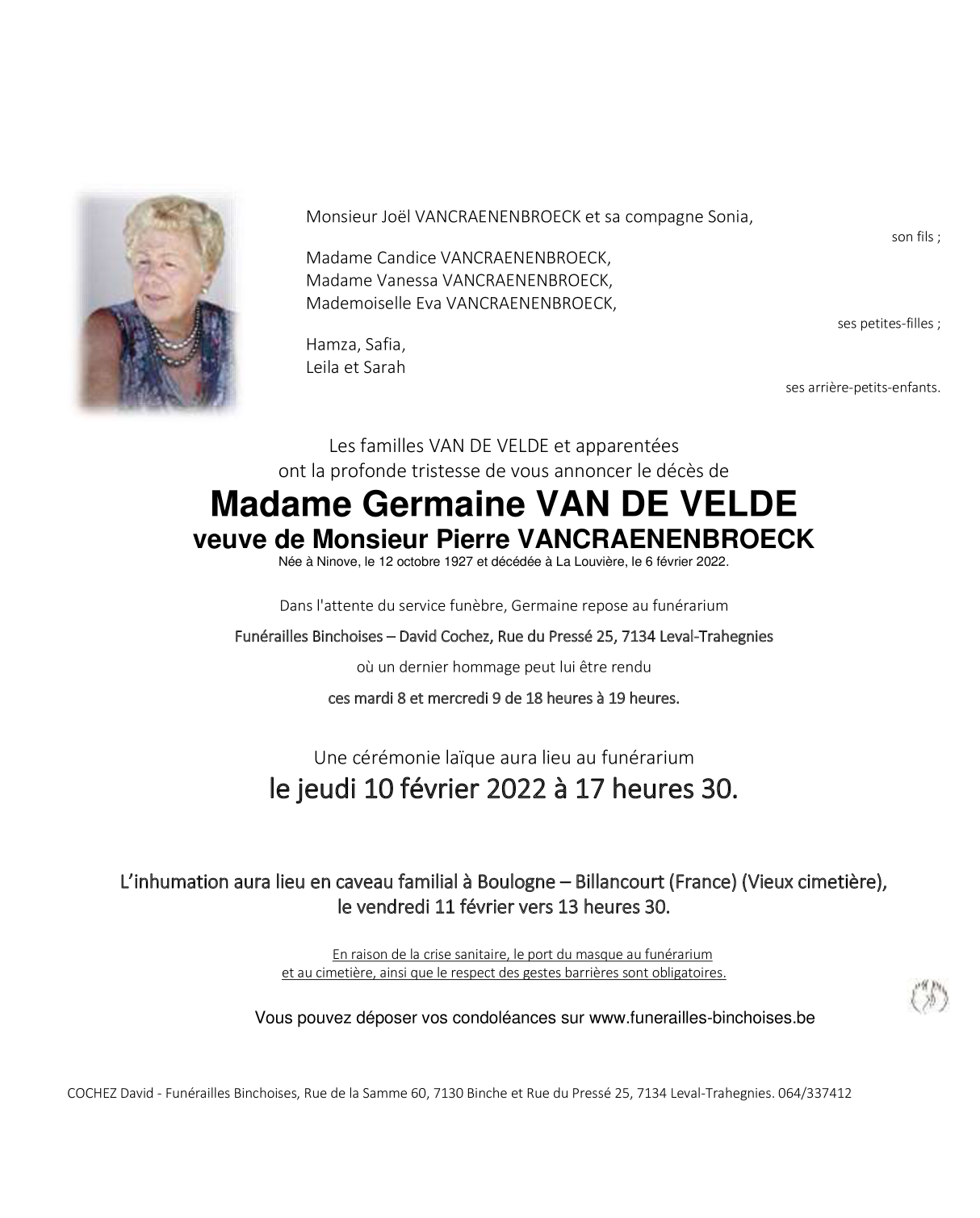 Madame Germaine VAN DE VELDE