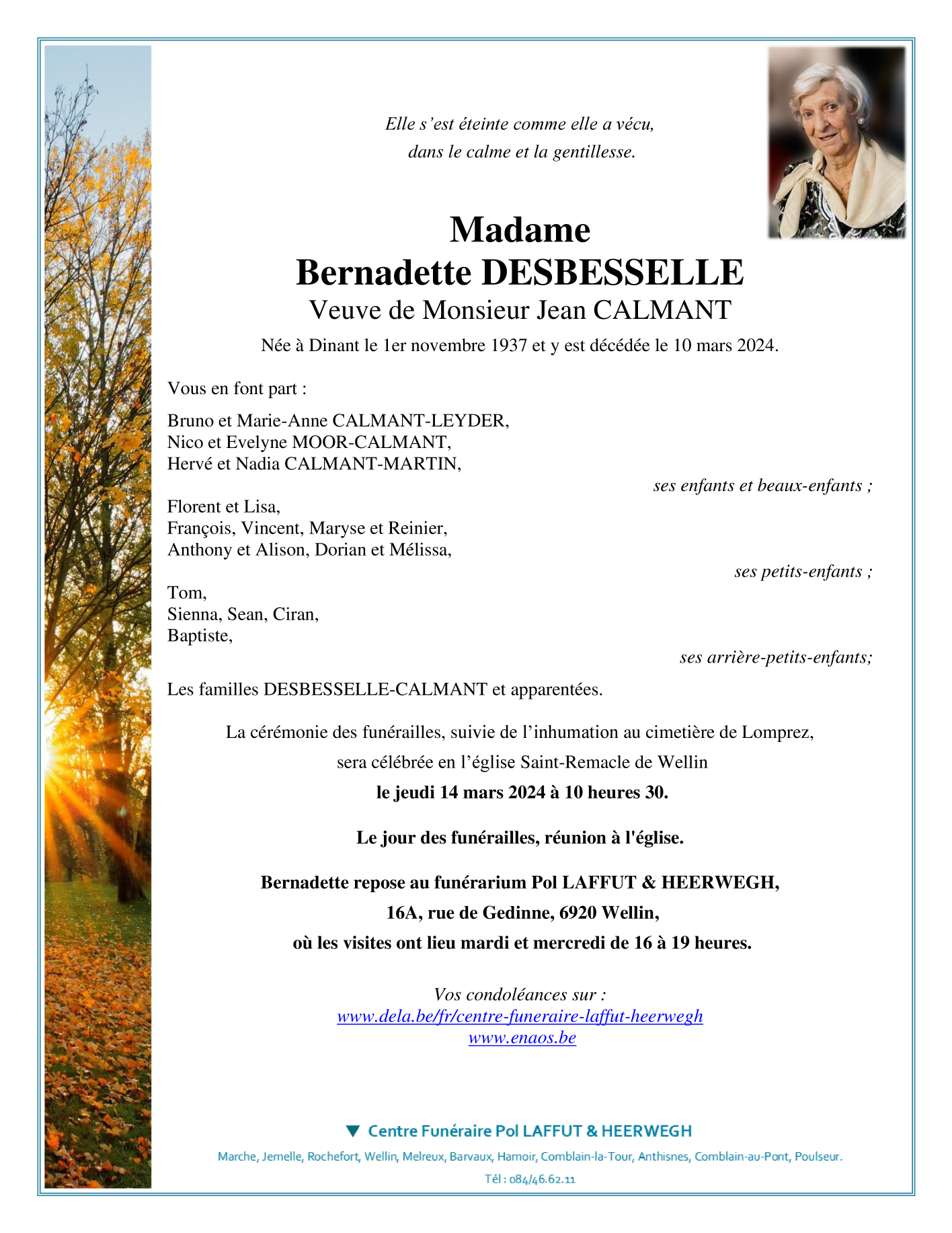 Décédée à Dinant (5500) le dimanche 10 mars 2024 à l'âge de 86 ans