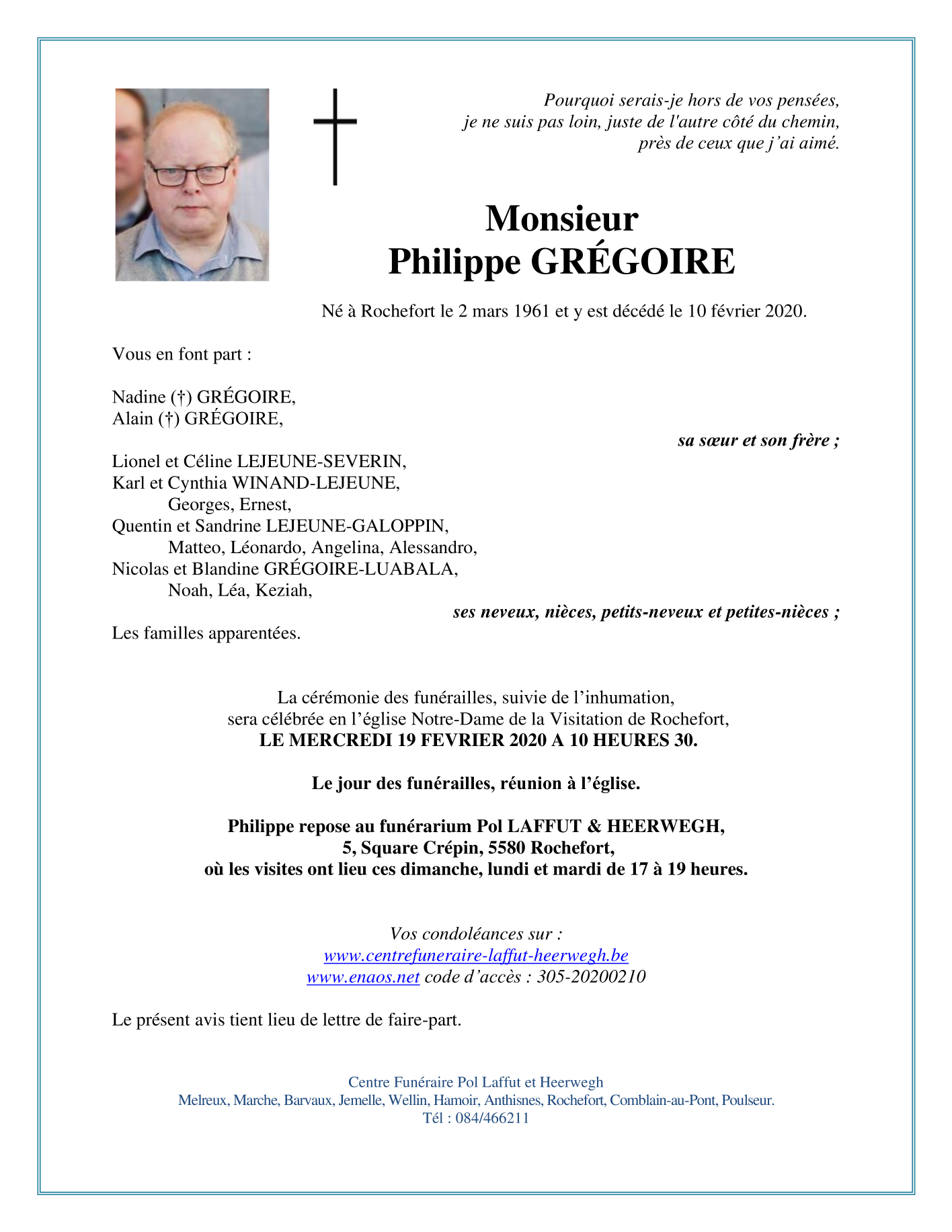 Décédé à Rochefort (5580) le lundi 10 février 2020 à l'âge de 58 ans