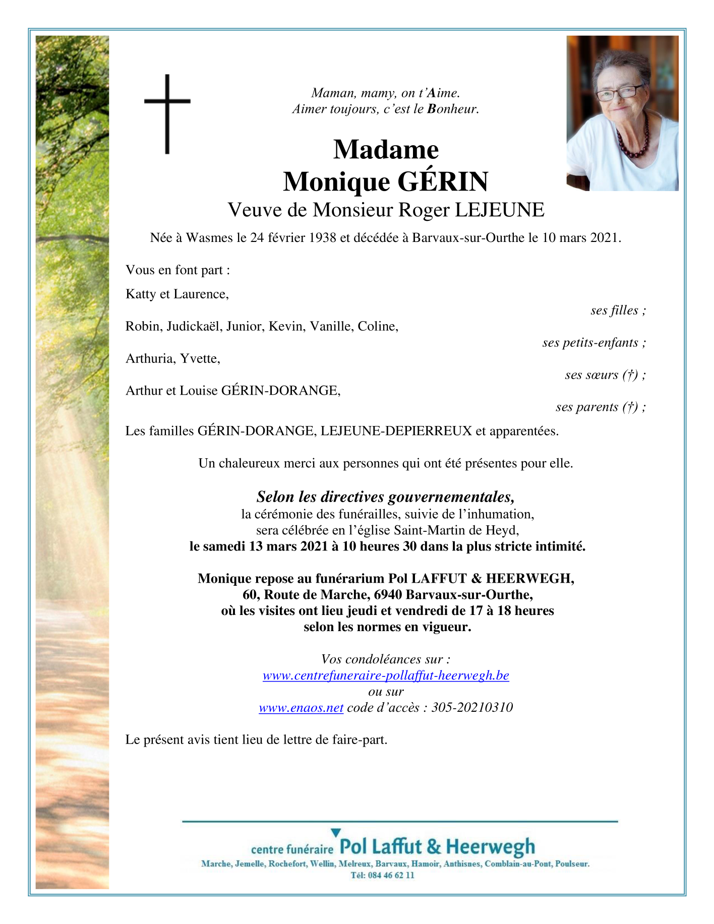 Décédée à Barvaux-sur-Ourthe (6940) le mercredi 10 mars 2021 à l'âge de 83 ans