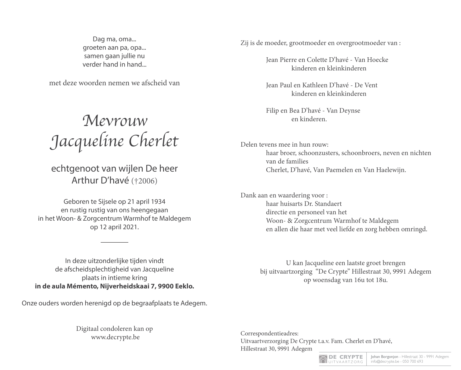 Fallecida en Maldegem (9990) el lunes, 12 de abril de 2021 a la edad de 86 años