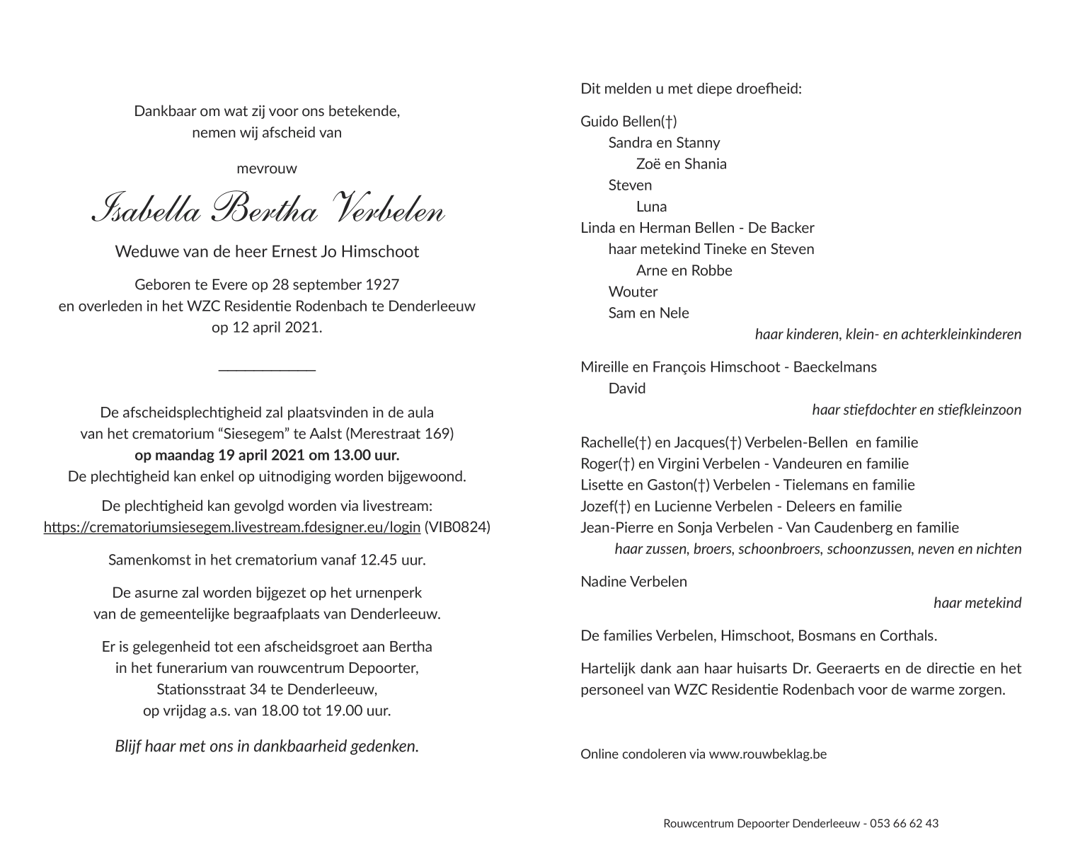 Décédée à Denderleeuw (9470) le lundi 12 avril 2021 à l'âge de 93 ans