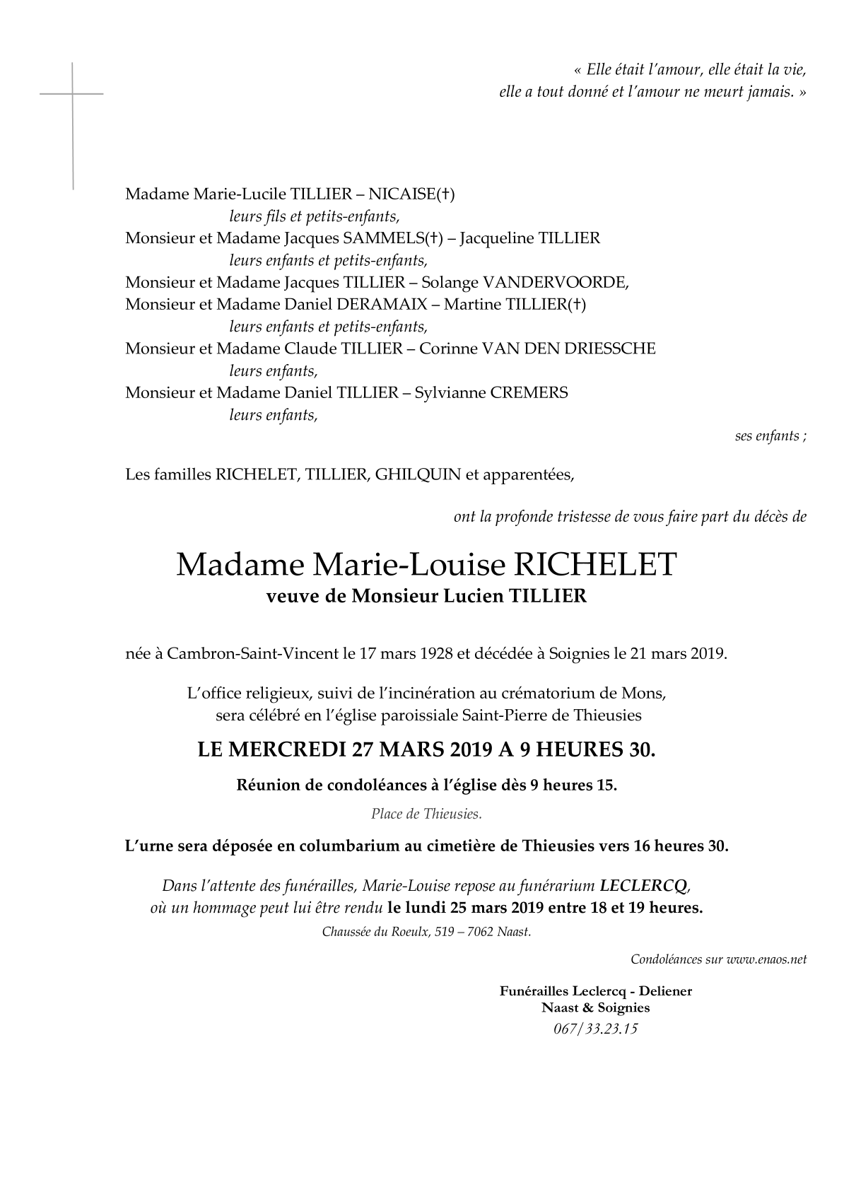 Fallecida en Soignies (7060) el jueves, 21 de marzo de 2019 a la edad de 91 años