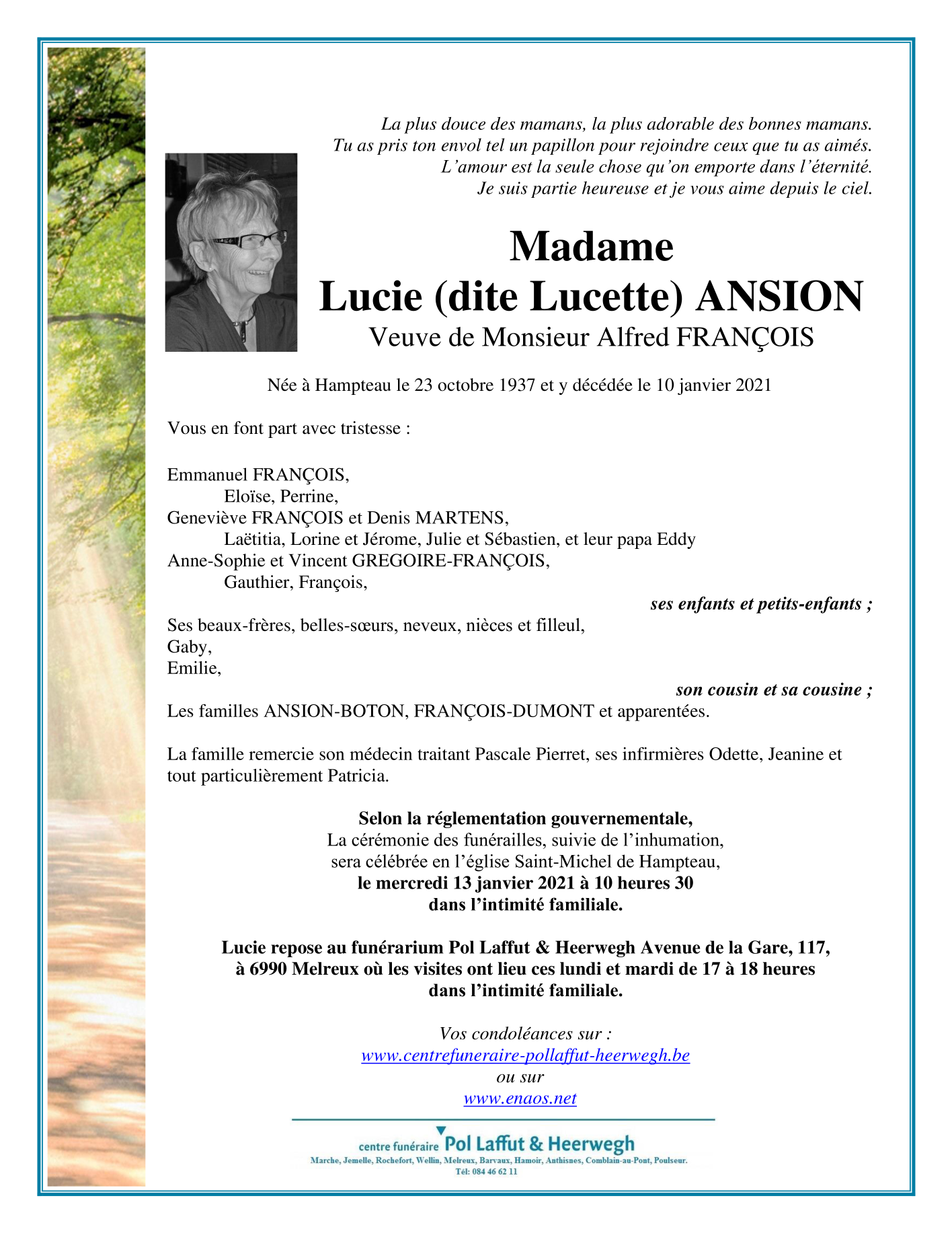 Died in Hampteau (6990) on 10 January 2021 at the age of 83 years