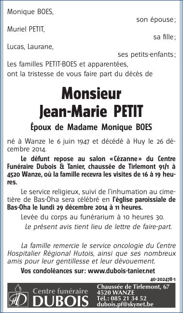 Fallecido en Huy (4500) el viernes, 26 de diciembre de 2014 a la edad de 67 años