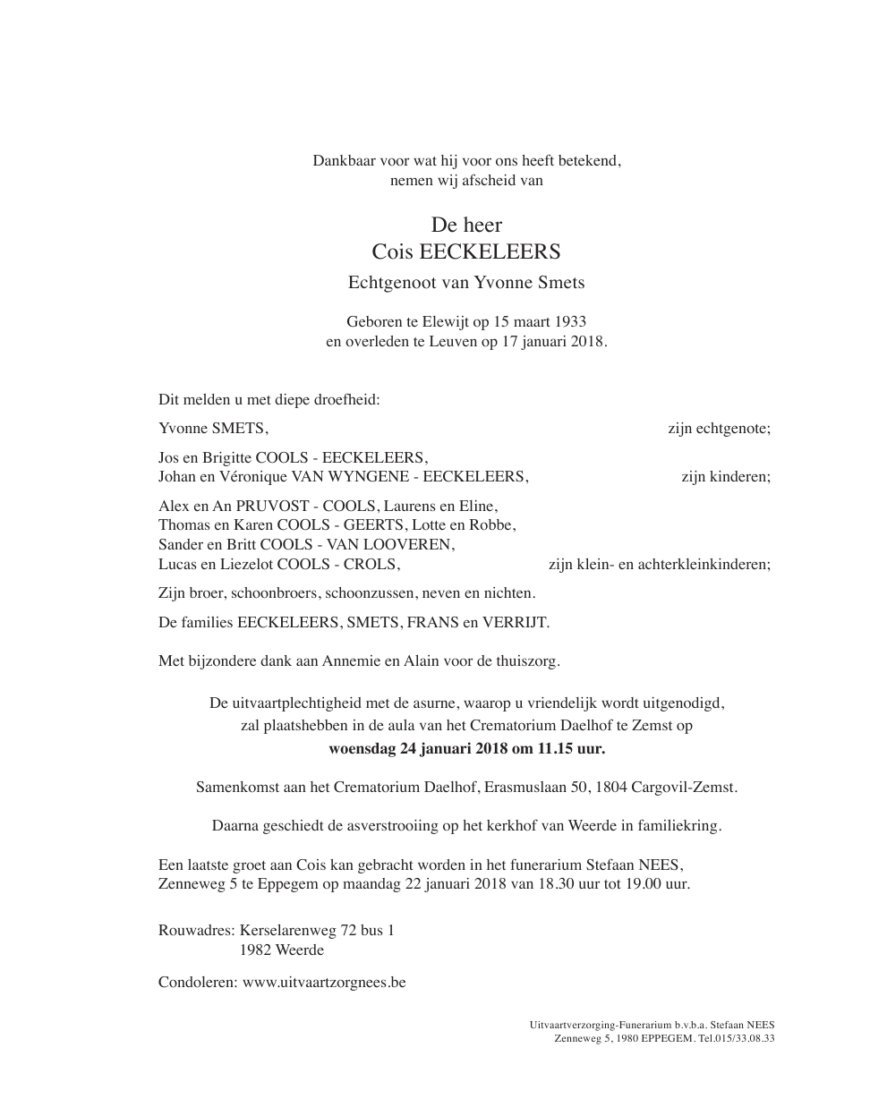 Décédé à Leuven (3000) le mercredi 17 janvier 2018 à l'âge de 84 ans