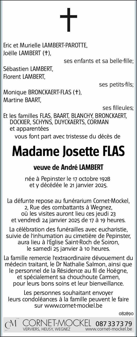 Décédée à Pepinster (4860) le mardi 21 janvier 2025 à l'âge de 96 ans