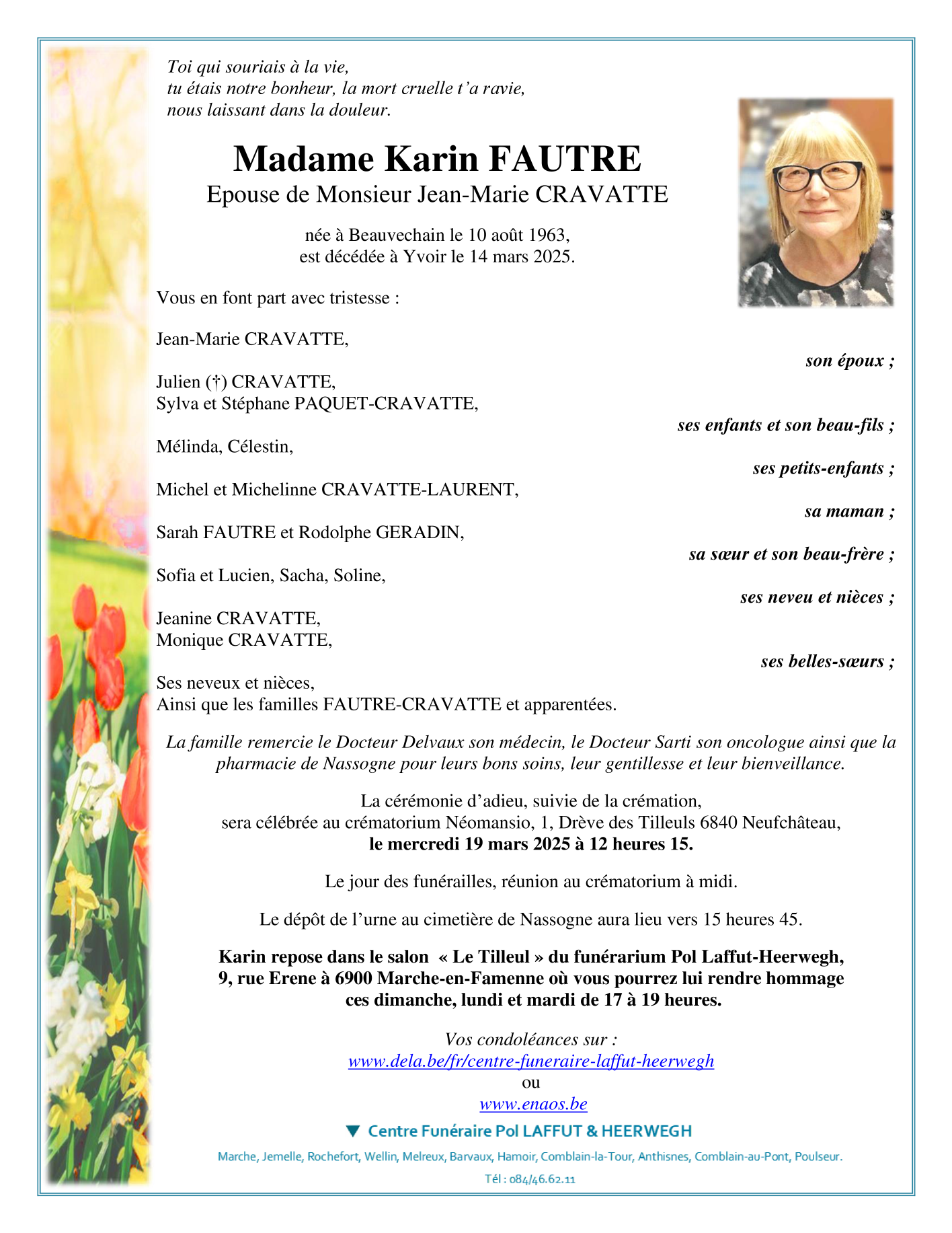 Décédée à Yvoir (5530) le vendredi 14 mars 2025 à l'âge de 61 ans
