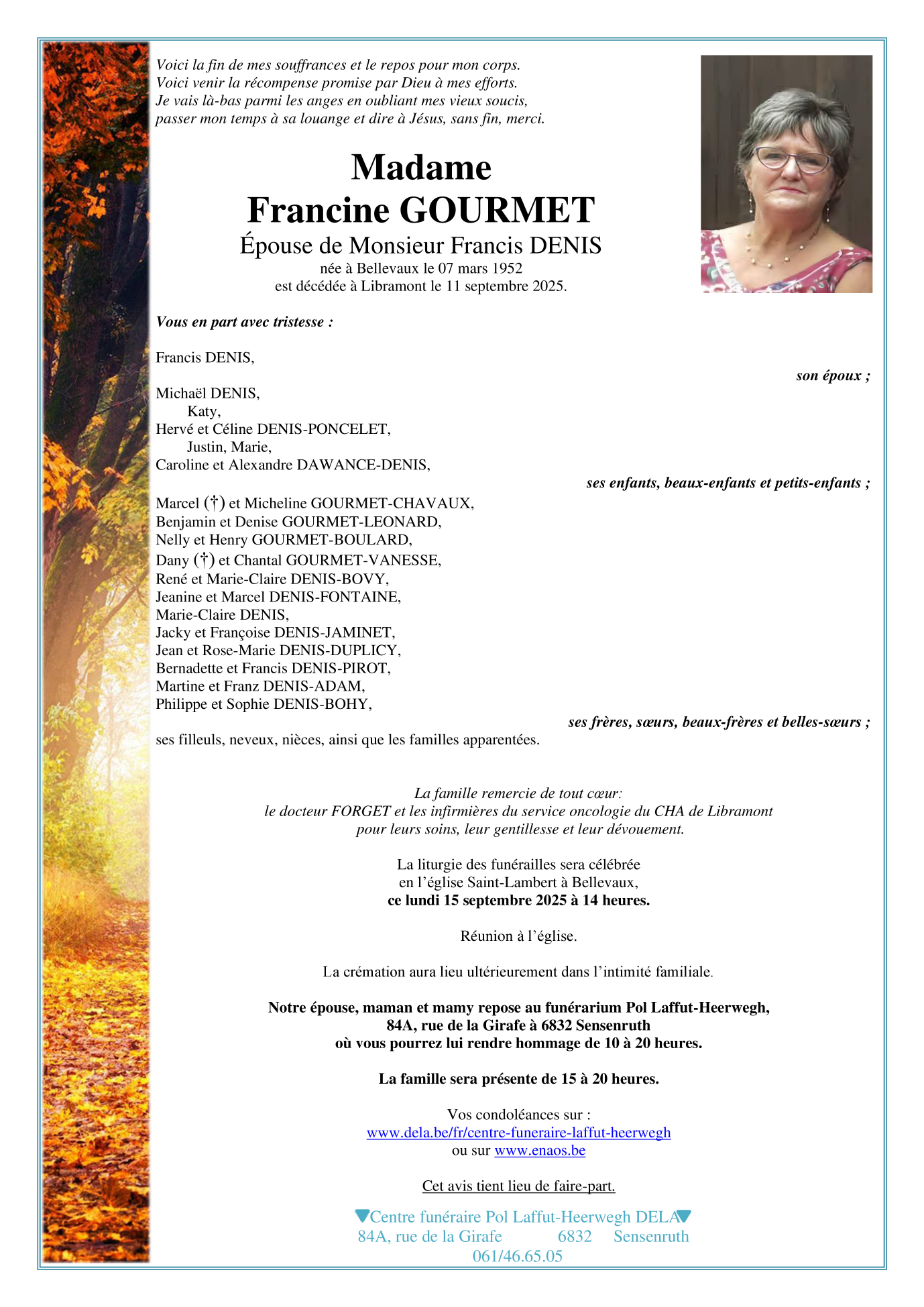 Décédée à Libramont-Chevigny (6800) le jeudi 11 septembre 2025 à l'âge de 73 ans