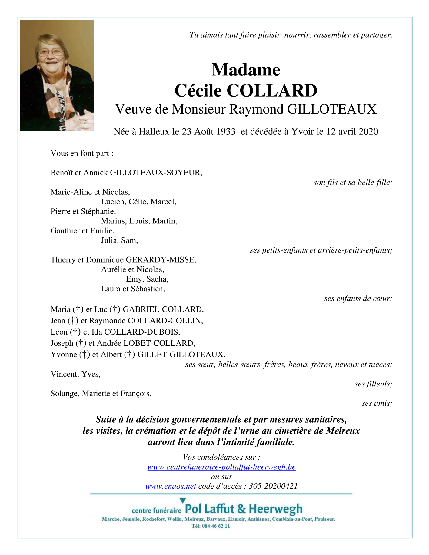 Fallecida en Yvoir (5530) el domingo, 12 de abril de 2020 a la edad de 86 años
